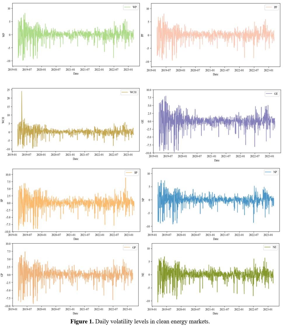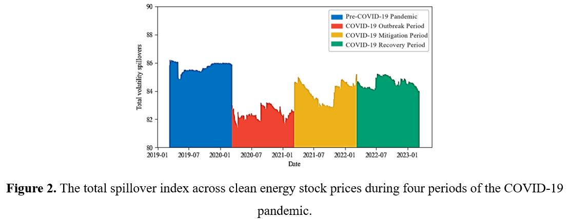 清洁能源在世界各国发挥着重要作用,包括应对气候变化,减少外部能源供应风险,创造就业机会等。Ghosh(2022)研究表明,在COVID-19大流行期间,全球不确定性和地缘政治风险影响了能源和股票市场,这种影响反映在能源股,特别是清洁能源股的波动性上。这表明清洁能源市场不是孤立的,其内部金融资产在全球或区域性危机中相互影响,表现出风险传染的特征。然而,清洁能源股票价格的风险传染机制尚不清楚,其背后影响因素也不明晰。因此,该项工作将COVID-19分为四个时期,探讨了清洁能源股票价格的风险溢出效应特征。此外,该项工作不仅考虑了外部因素的影响,还考虑了结构性因素对COVID-19四个时期下清洁能源股价风险溢出效应的影响(部分图片如下)。