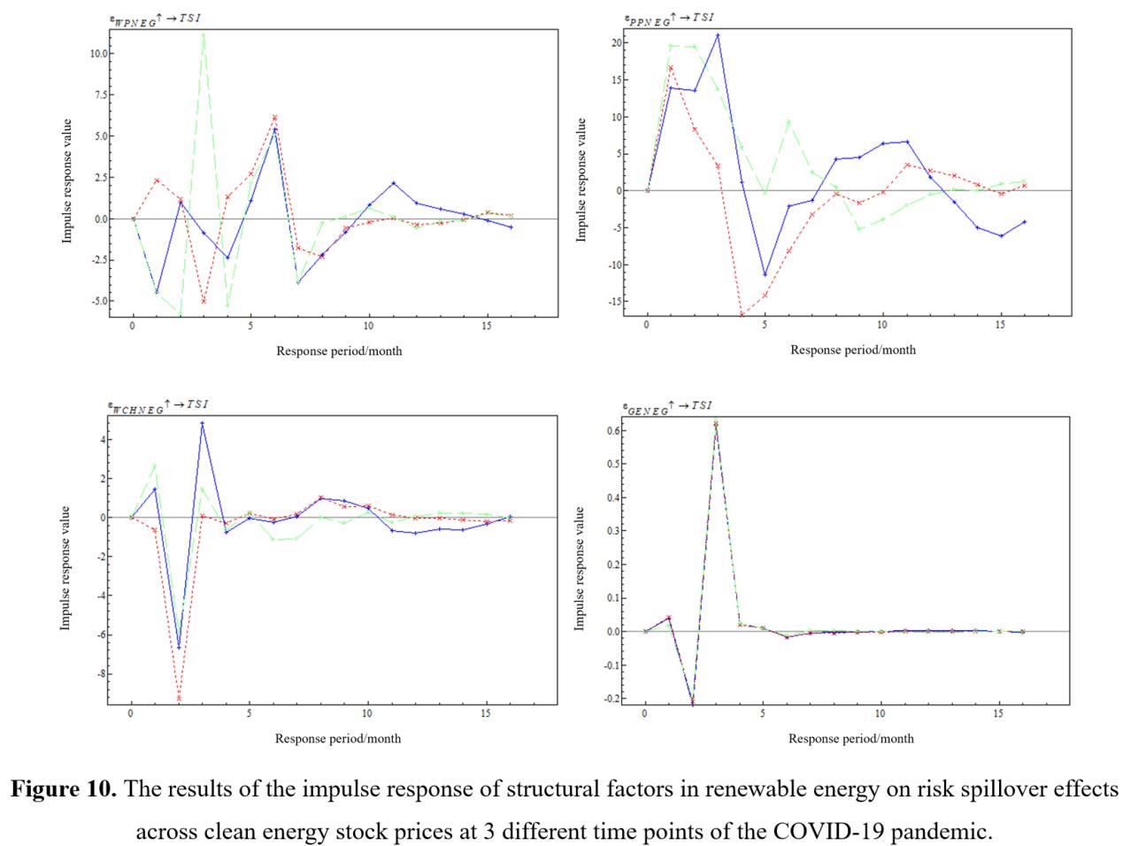 实证结果表明,新冠肺炎疫情后,智能电网和三种可再生能源(光伏、风能和水电)是清洁能源股价净风险溢出效应的主要传递者,而传统能源的清洁高效利用始终是净风险溢出效应的吸收者。在影响因素方面,结构性因素(各类清洁能源净发电量)对整个清洁能源股价风险溢出效应的影响一般大于外部因素(经济因素和政治因素),且持续时间更长。最后,在结构性因素中,风能和光伏这两种可再生能源的净发电量影响更大,特别是在新冠肺炎疫情爆发和缓解期。除可再生能源外,智能电网和核电的净发电量在新冠肺炎疫情后的复苏期间也产生了重大影响。这些新发现为清洁能源市场的投资者和政策制定者提供了有益的启示。