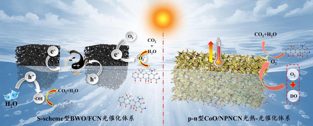 S-scheme型BWO/FCN光催化体系与p-n型CoO/NPNCN光热-光催化体系降解四环素的机理图