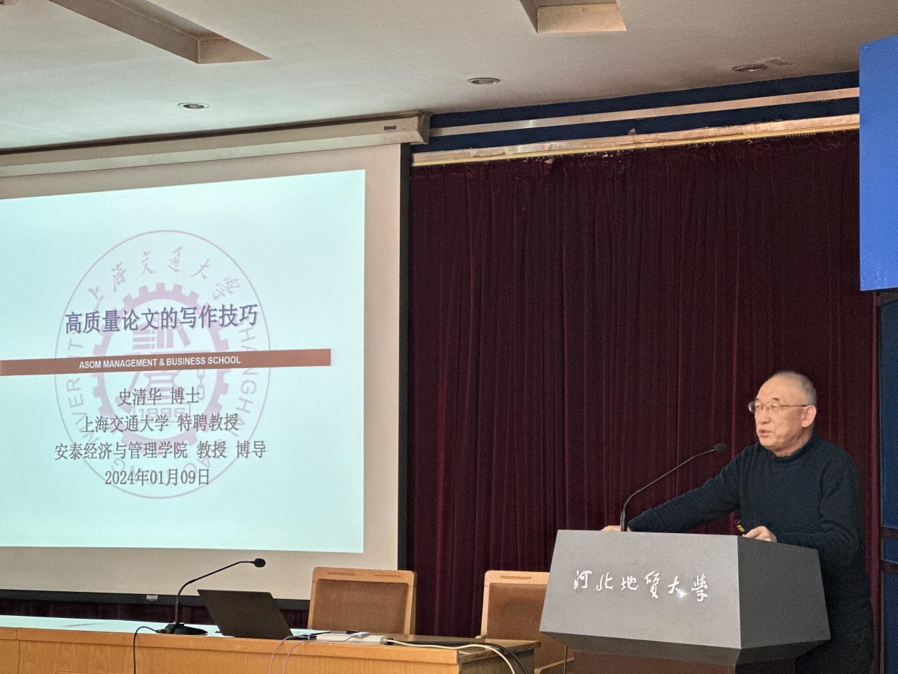 2024年1月8日,上海交通大学特聘教授,安泰经济与管理学院二级教授、博士生导师史清华应邀在一号教学楼9楼报告厅为经济学院师生作了题为“如何写一篇高质量论文”的学术讲座。本场讲座是bat365官网“九鼎讲座”系列讲座之一,由bat365正版唯一官网教育发展基金会“九鼎讲座基金”赞助。讲座由经济学院院长牛建高教授主持,经济学院教师及研究生参加了讲座。