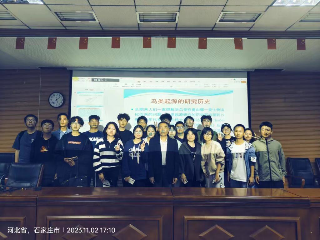 为迎接学校70周年校庆,11月2日下午,地球科学学院古生物研究中心首席科学家季强教授在北校区图书馆四楼报告厅为地球科学学院2023级全体新生做了一场别样的“新生导论”学术讲座,讲座围绕“鸟类的起源”、“鸟类的演化模式”、“古人类的进化”等问题展开,图文并茂的给同学们讲述了其早期与近期的研究成果和学科相关方向的前沿发展,勉励同学们好好学习。“我是很尊重在场的各位同学的。”季强教授说,“很多院士在我们学校度过了本科阶段的学习,说不定你们中今后有人会成为伟大的科学家,成为院士”季强教授风趣的给予在场同学美好的期望,鼓励大家扎实学研,早日成才。