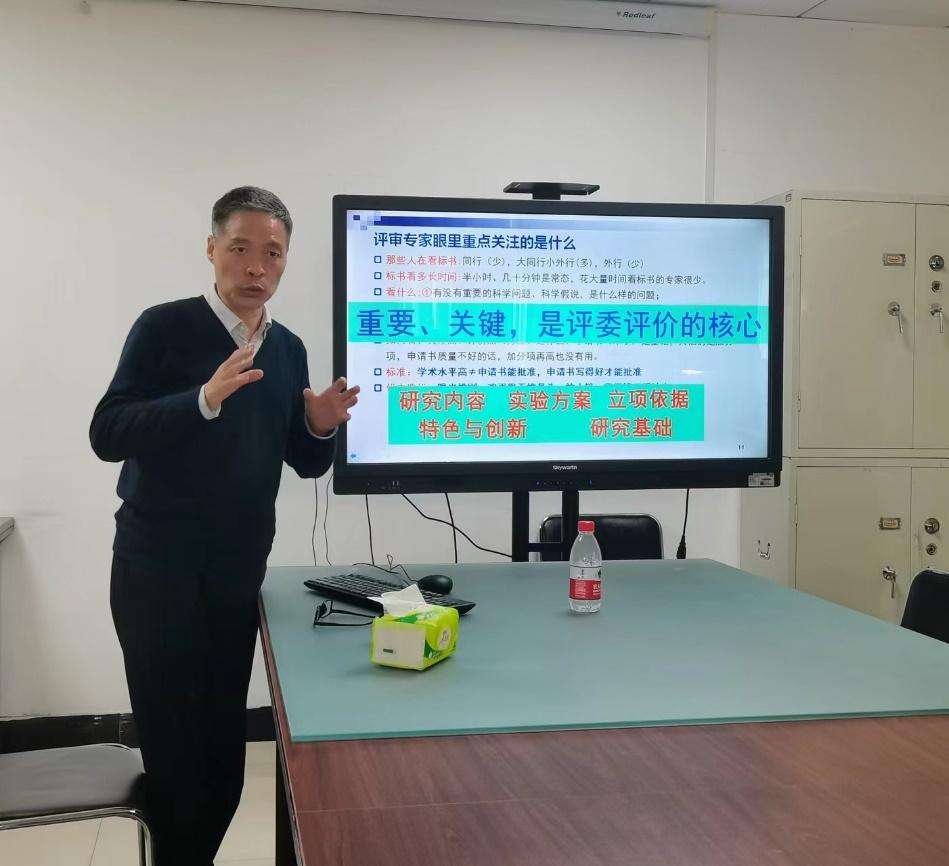 王文龙研究员从国家自然科学基金申请书评审要点、撰写技巧和应注意的重要问题三方面进行了讲解,结合实例,从选题与意义、研究体量与深度、创新性、可行性及研究基础与研究实例等方面进行了系统全面的分析。报告后,王文龙研究员和与会教师对国家基金申报进行了深入的讨论与交流。王文龙研究员的报告内容丰富、重点突出、联系实际,使大家获益匪浅,广受好评。
