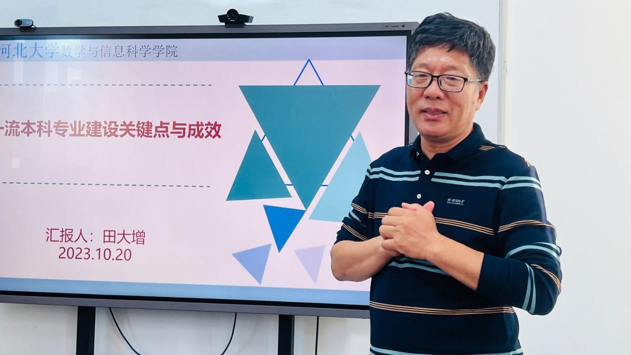 10月20日下午,应数理教学部邀请,河北大学数学与信息科学学院田大增教授到bat365官网作关于一流本科专业建设经验的交流分享。会议由数理教学部主任曹南斌主持,各教研室主任以及教师代表参加了会议。