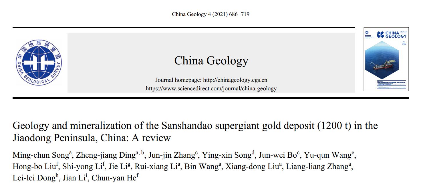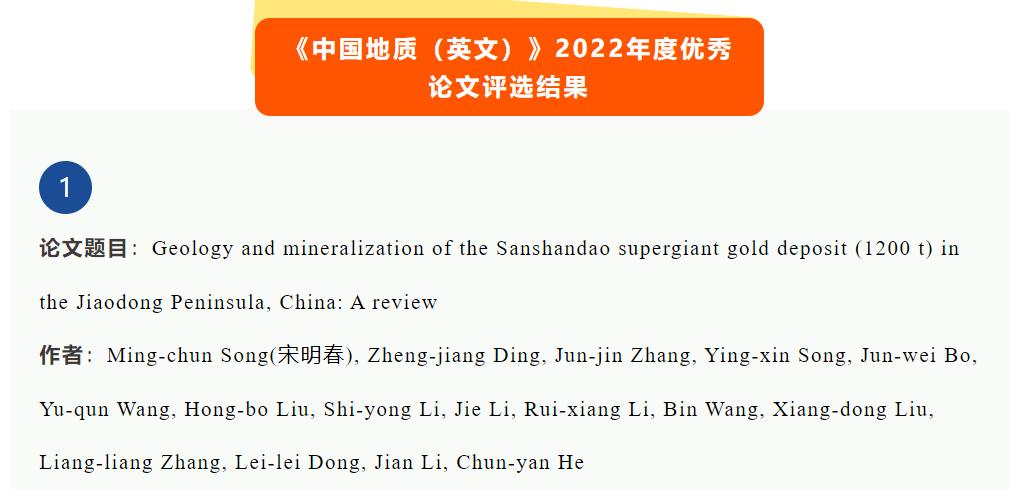bat365官网宋明春教授的“Geology and mineralization of the Sanshandao supergiant gold deposit (1200 t) in the Jiaodong Peninsula, China: A review(胶东三山岛超巨型胶东型金矿床地质和成矿作用综述)”一文被评选为优秀论文。