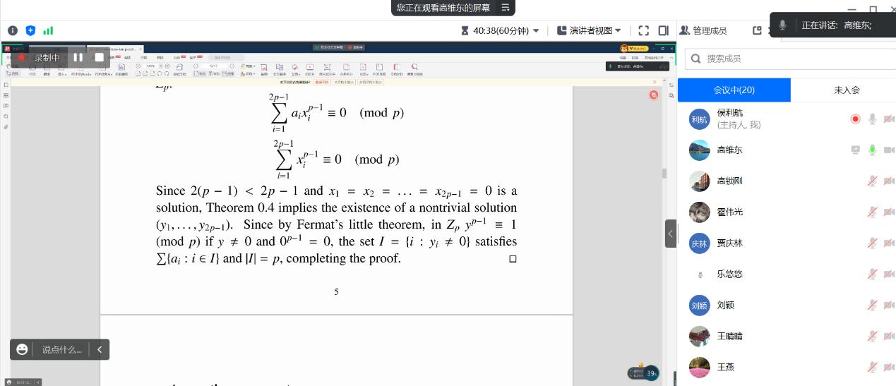 高维东教授结合自身的科研成果,详细地介绍了关于Erdos-Ginzburg-Ziv定理证明的几个不同数学方法, 使线上师生进一步领略到了数学的魅力。报告后,高维东教授就线上师生提出的问题,与教学部师生进行了深入的交流。近期系列学术报告,教学部师生积极参与,反响热烈。数理教学部将进一步邀请交叉学科方面的专家积极探索学科交叉的可行性,营造浓厚的科研氛围,提升师生科学研究水平。