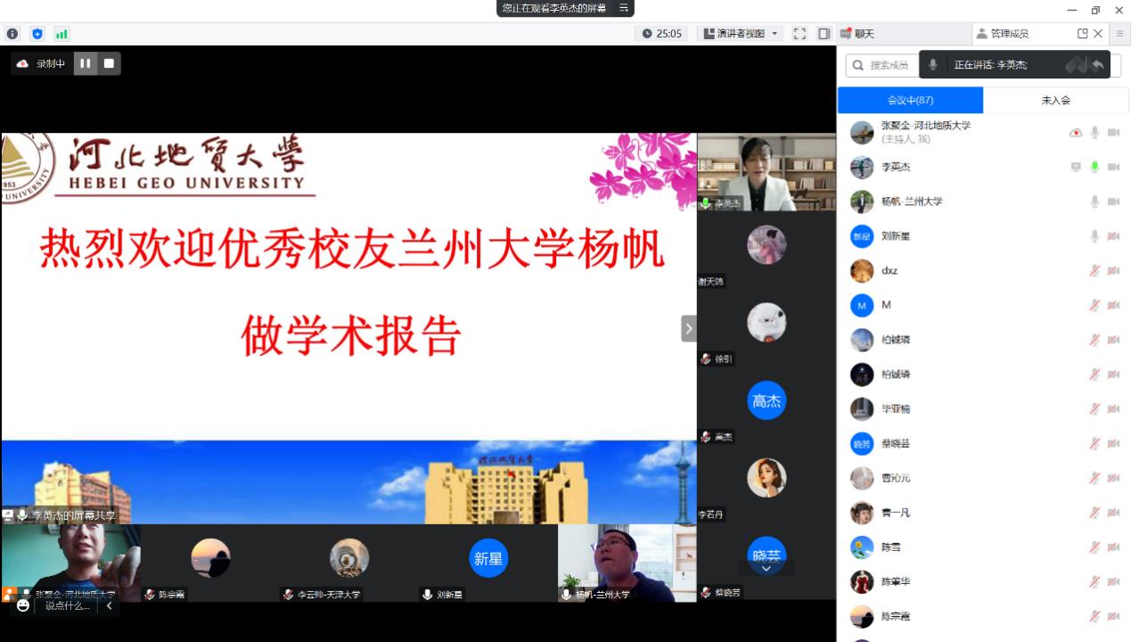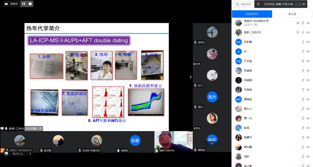 2023年4月16日,bat365官网2013届优秀校友兰州大学杨帆副教授为bat365官网师生作了题为“中低温热年代学在矿床剥蚀保存变化过程中的应用”的线上学术报告。报告由地球科学学院副院长李英杰教授主持,bat365官网师生及部分对报告感兴趣的校外人士共百余人参加了学术报告会。