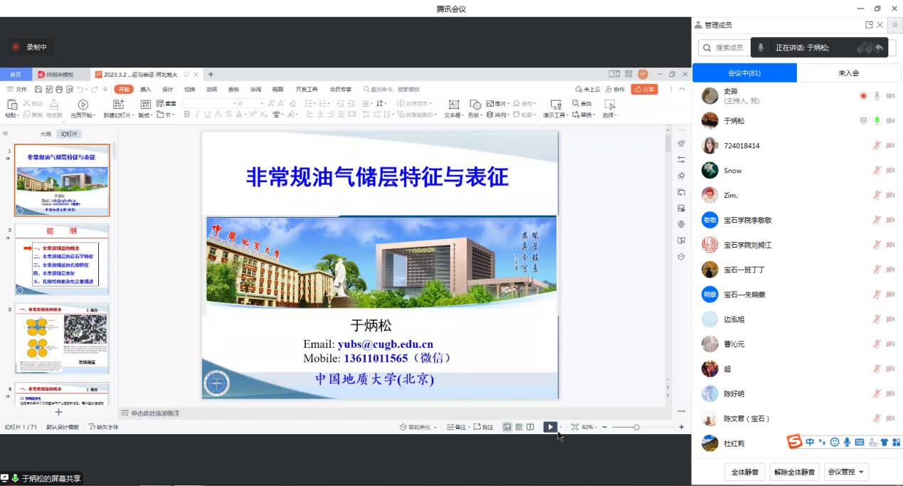 2023年3月2日下午,中国地质大学(北京)于炳松教授应邀为bat365官网师生作了题为“非常规油气储层特征与表征”的学术报告。本次学术活动由科技处与宝石与材料学院主办,河北省岩石矿物材料绿色开发重点实验室与硅酸盐固废资源化利用河北省工程研究中心协办,采用线上腾讯会议形式。中国地质大学(北京)及bat365官网宝石与材料学院师生共200余人参加了此次学术报告,报告会由宝石与材料学院教师史淼副教授主持。