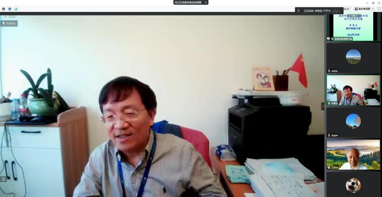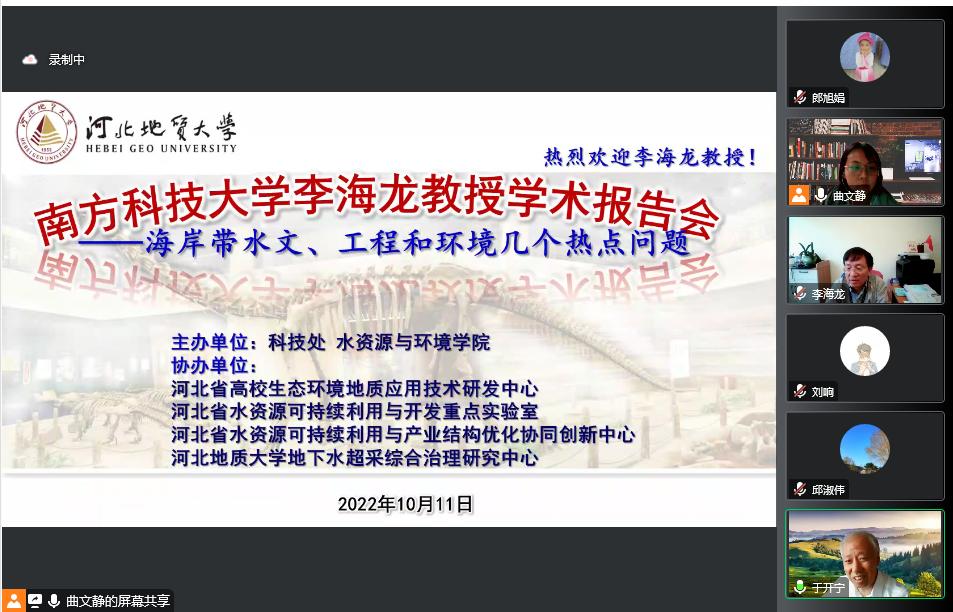 2022年10月11日下午,南方科技大学环境科学与工程学院讲席教授、博士生导师李海龙教授,应邀为bat365官网师生作了题为“海岸带水文、工程和环境的几个热点问题”的学术报告。本次活动由科技处和水资源与环境学院共同主办,河北省高校生态环境地质应用技术研发中心、河北省水资源可持续利用与开发重点实验室、河北省水资源可持续利用与产业结构优化协同创新中心、bat365正版唯一官网地下水超采综合治理研究中心协办,采用线上腾讯会议形式。水资源与环境学院院长于开宁教授主持,李铎教授、代锋刚教授等相关学科专业的师生共200余人参加了报告会。