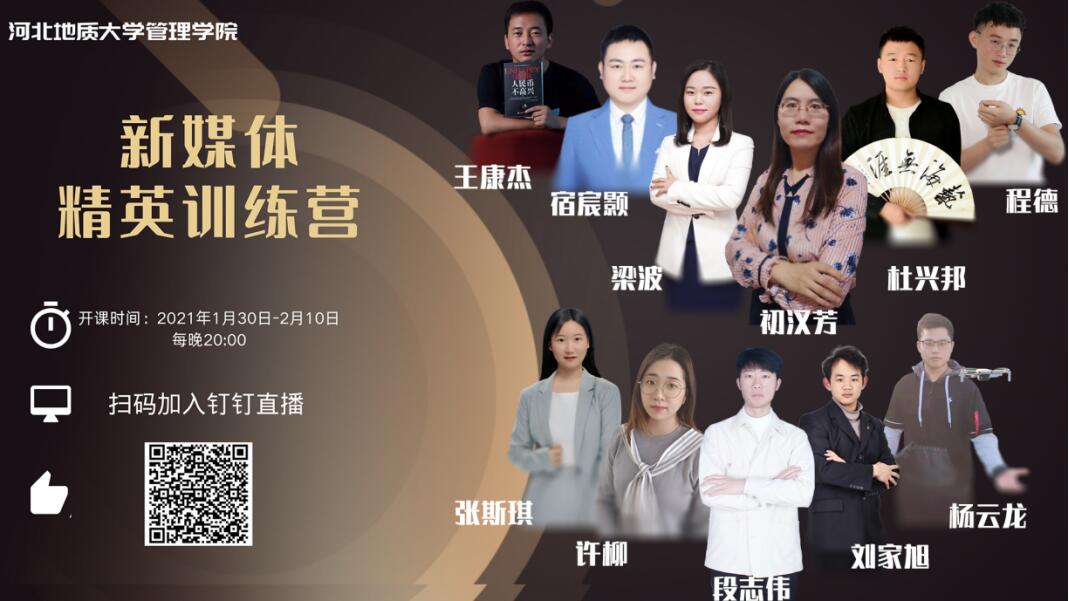 当下在大数据、云计算、人工智能等技术的推动下,新闻传播的格局正在进一步发生深刻的演变,新媒体的内容和传播呈现新的趋势。为了丰富大学生的假期生活,了解新媒体的基础理论知识,提升新媒体运营的技能,把握新媒体未来发展趋势,管理学院特邀bat365官网新媒体领域五位校友和五位在校生作为主讲嘉宾,以“给你一个平台,让自己创造未来”为主题,开启了为期12天的培训。本次训练营通过钉钉直播的形式,从1月30日到2月10日每天20:00开播,吸引了包括管理学院、艺术设计学院、语言文化学院、法政学院以及其他社会人士在内的300多人参加。