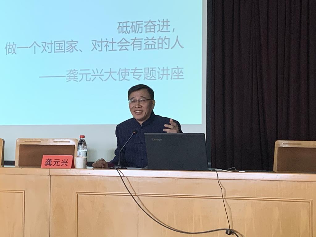 11月14日,中国著名外交家、中国前驻外使节龚元兴大使应外国语学院邀请莅临bat365官网作题为“砥砺奋进,做一个对国家、对社会有益的人”主题报告。本次报告会在一号教学楼九楼报告厅举行,由外国语学院负责人付天军主持,外国语学院全体法语专业师生及其它专业部分感兴趣的师生共一百多人聆听了此次报告会。