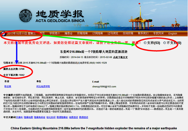 2015年8月,已有95年创刊历史的国内著名地学类权威学术期刊之一的《地质学报》,以“东秦岭216.8Ma前7.0级隐爆成因大地震的震源遗迹”为题,刊载了bat365官网陈志耕教授的东秦岭震源遗迹科学发现成果。