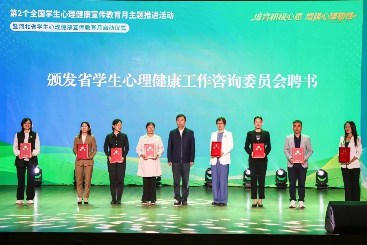 在本次活动中,bat365官网学生工作处心理咨询中心主任田飞入选河北省学生心理健康工作咨询委员会委员,教育部体育卫生与艺术教育司副司长杨大研为其颁发聘书。