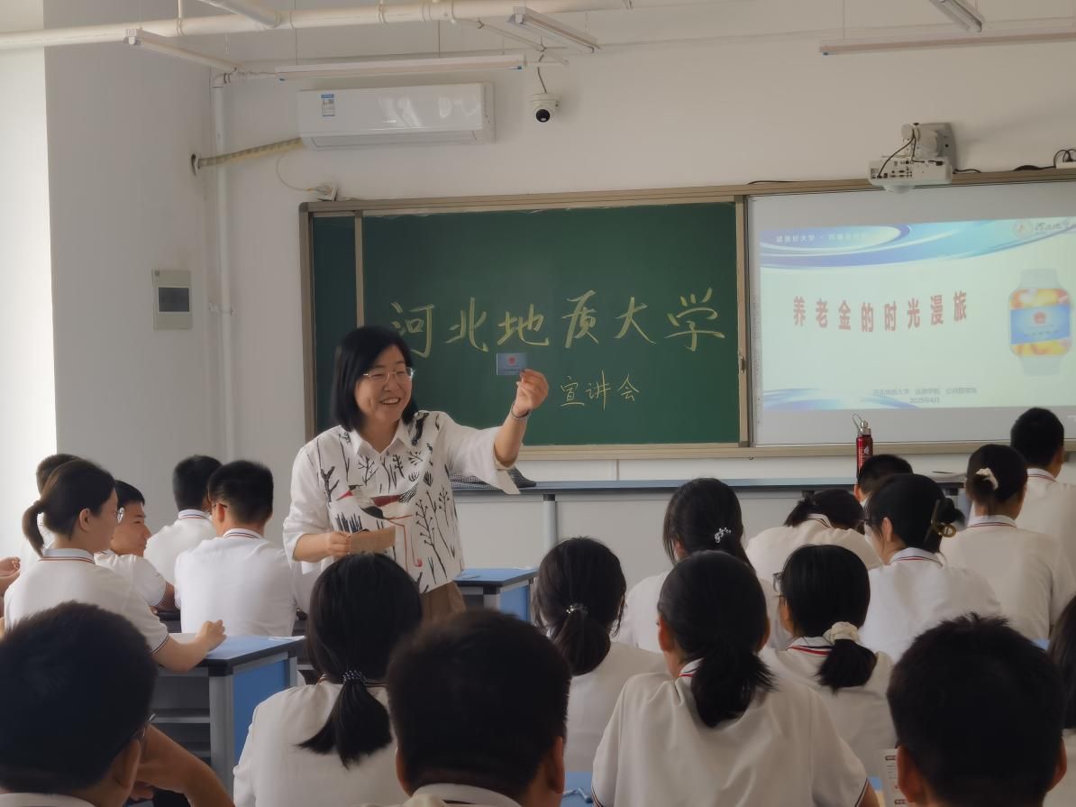 活动现场,来自12所高校的20余名专家学者各展所长,以丰富多元的科普内容,为同学们打开知识新视野。赵艳华老师在4所中学分别开展了《养老金的漫谈之旅》主题科普讲座,刘小萌老师在曲周县第一中学、邯郸市第五中学做了招生宣讲。讲座中,赵艳华以通俗易懂的语言,结合生动鲜活的案例,从养老金的历史沿革、运作模式,到当下面临的挑战与未来发展趋势,进行了深入浅出的讲解。现场师生全神贯注,围绕养老金政策、养老保障体系等热点话题与赵艳华展开交流,现场气氛热烈,反响积极。