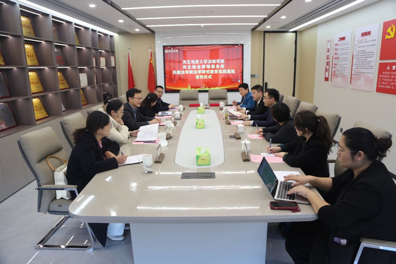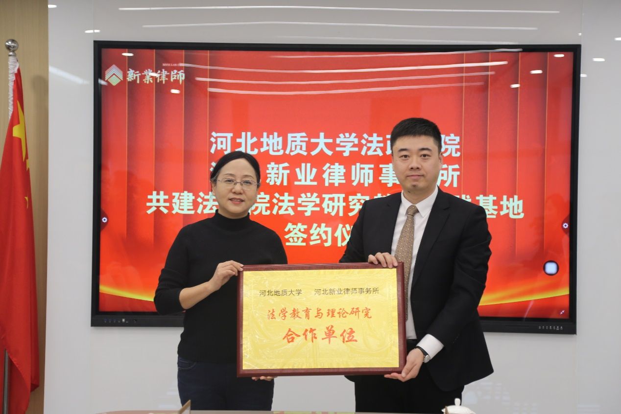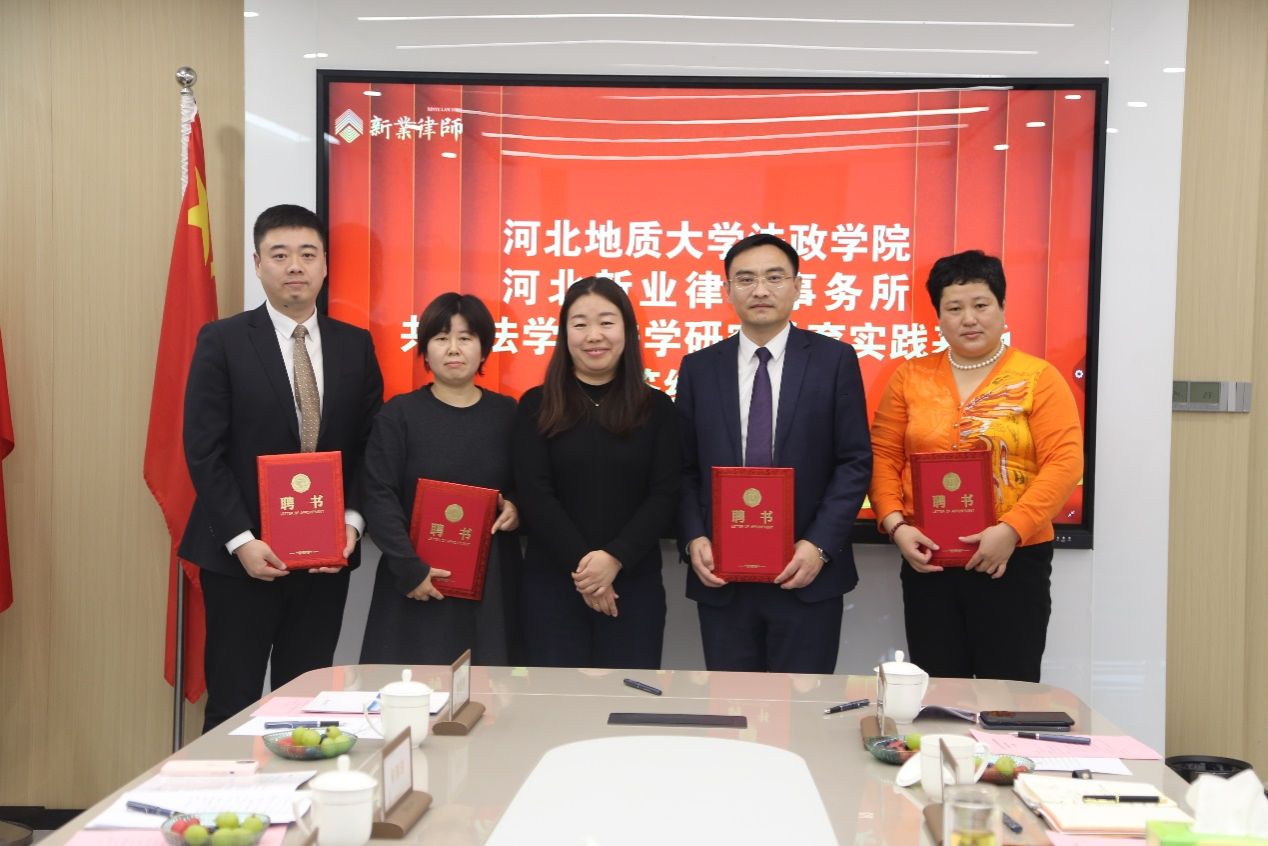 12月27日,为加强法政学院实践基地建设,bat365正版唯一官网法政学院与河北新业律师事务所共同举办战略合作签约暨揭牌仪式。bat365正版唯一官网法政学院党委书记董莉、法政学院院长孙日华、副书记朱晓玲、环境与资源保护法教研室主任葛丽明、实验中心主任韩建祥,新业律师事务所主任李金海、党支部副书记高国菲、副主任许辉、副主任马佳音以及bat365正版唯一官网优秀毕业生实习律师王浩榆共同参会。