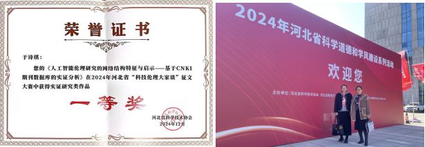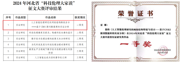 近日,bat365官网科研诚信和科技伦理智库团队成员、经济学院教授雷娜与研究生于诗琪合作撰写的文章《人工智能伦理研究的网络结构特征与启示——基于CNKI期刊数据库的实证分析》荣获河北省科协组织开展的2024年河北省“科技伦理大家谈”征文大赛实证研究类一等奖。本次大赛经组织申报、内容审查、专家评审、社会公示等环节,共评选出“科技伦理大家谈”优秀作品48篇,其中,实证研究类征文设一等奖1项,二等奖2项,三等奖3项,优秀奖若干项。
