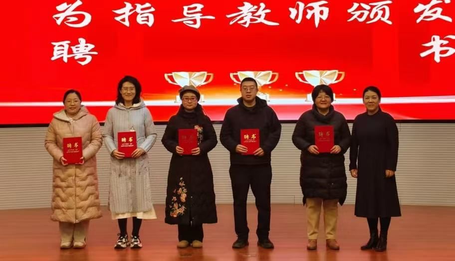在场领导为获奖学生代表颁奖,为获奖教师发放聘书。
