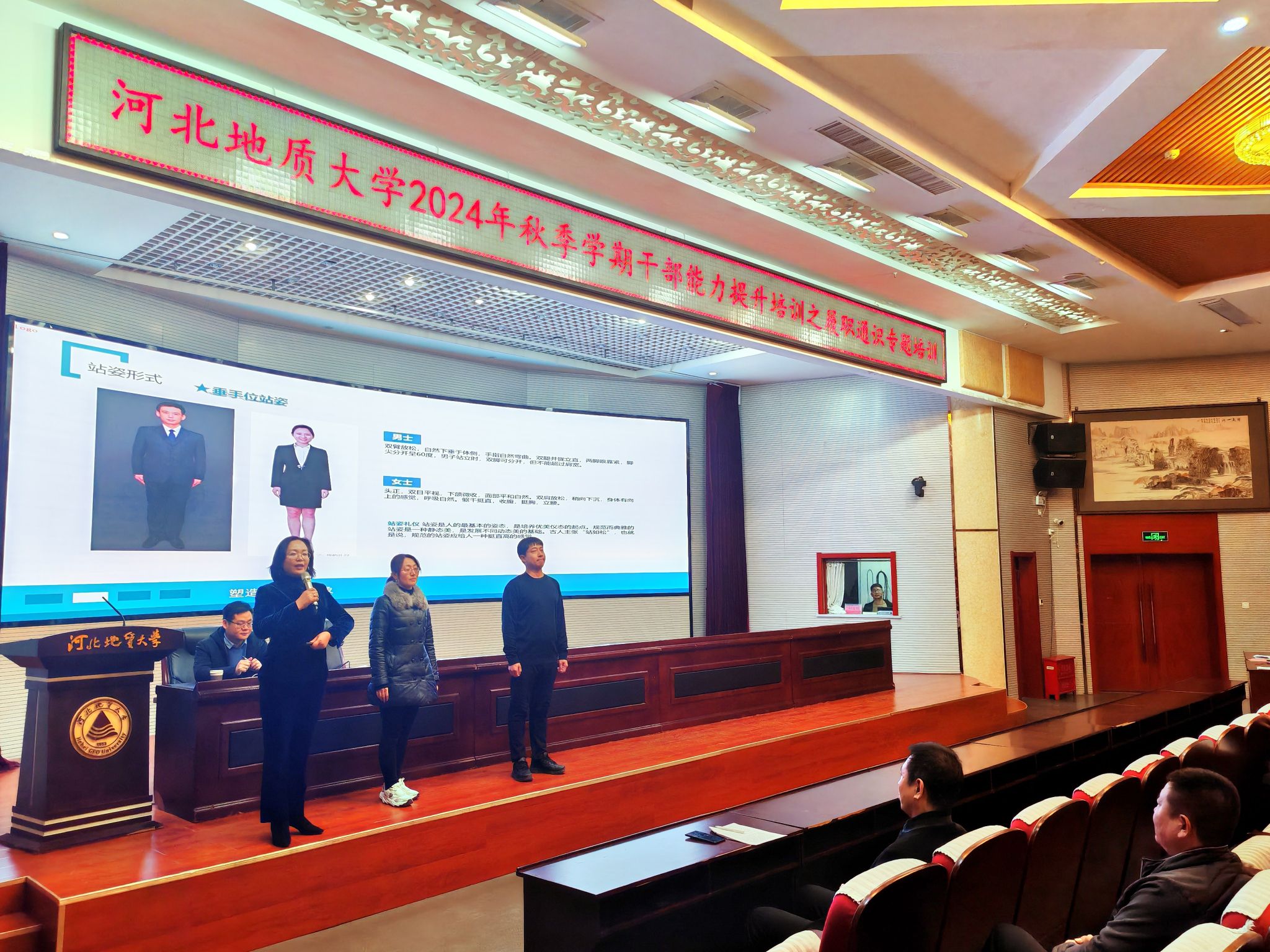 11月28日下午,bat365官网在春秋讲堂举办礼仪专题培训。会议邀请到石家庄市接待中心张梁科长进行专题授课。校党委组织部常务副部长伦关臣主持培训会。