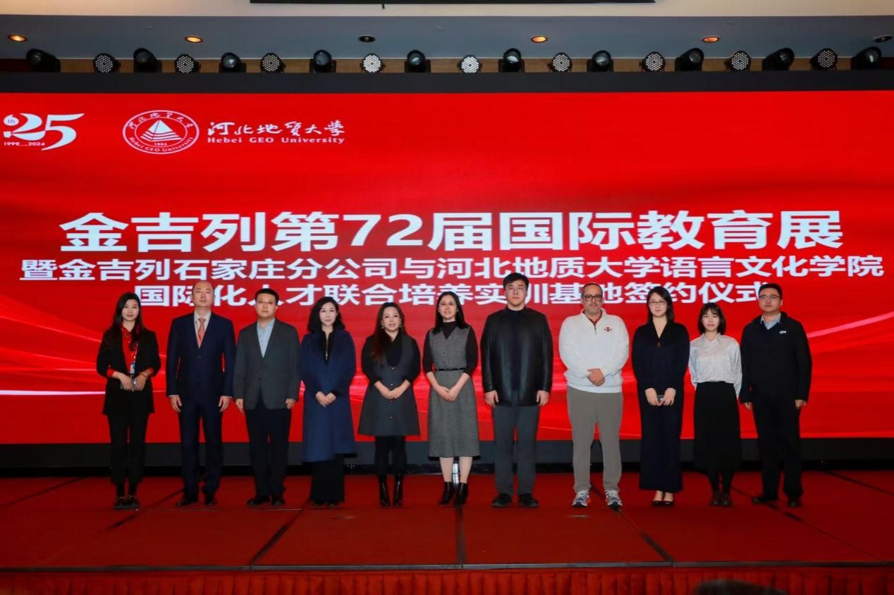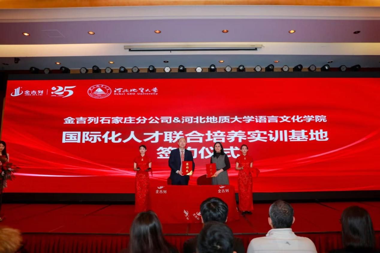 11月16日,bat365官网语言文化学院与金吉列石家庄分公司在石家庄世贸广场酒店签署合作协议,共同成立国际化人才联合培养实训基地,院党委书记宋朝霞、副书记杨旭辉、金吉列国际教育集团首席运营官牛雅卓、高级副总裁王宁、石家庄分公司总经理房晓敏等出席签约仪式。