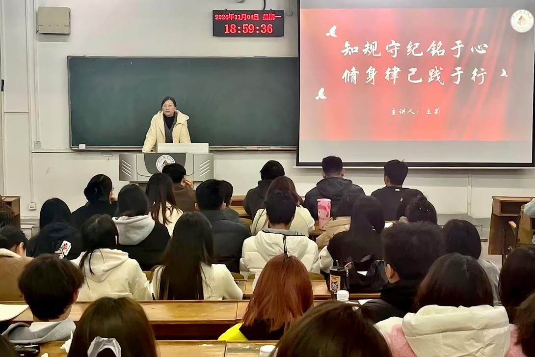 当晚,党委副书记王莉老师为学员们讲述了党的纪律,着重介绍了违纪和纪律处分相关内容,通过一个个生动的案例与同学们展开互动,让同学们在鲜活的事例中加深对于党的纪律的了解,真正做到知规守纪铭于心,修身律己践于行。