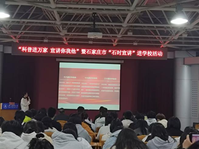 根据中共河北省委讲师团、河北省社会科学界联合会、河北省科学技术协会《关于开展“科普进万家 宣讲你我他”活动的通知》冀社科发〔2024〕11号相关安排,为推动石家庄市“科普进万家 宣讲你我他”“科普+宣讲”活动深入开展,科技处联合石家庄市科学技术协会、石家庄市社会科学院于10月31日下午2点半在科技报告厅开展“科普进万家 宣讲你我他”暨石家庄市“石时宣讲”进学校示范宣讲活动。石家庄市科协科普部部长段文涛、石家庄市社科院学会科普部部长刘献国、石家庄市科学普及中心部长吴君波、中共石家庄市委讲师团信息资料室主任陈战彬出席本次活动,bat365官网学生科技志愿服务队代表共207人参与本次活动。