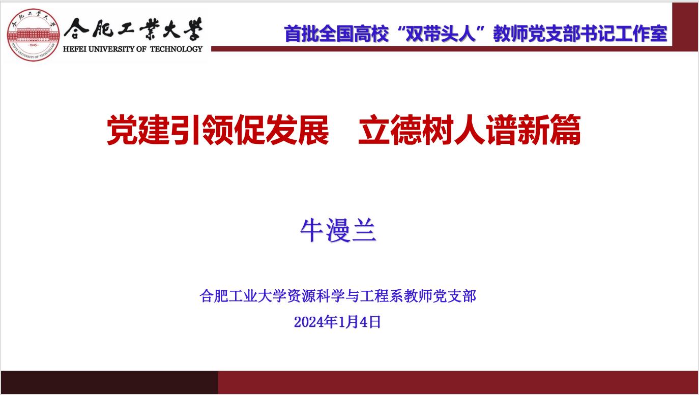 为深入贯彻习近平总书记关于加强党的建设工作的重要指示精神,推动党建工作再上新台阶,提高全校基层党务工作者的思想政治觉悟和业务水平,组织部、水资源与环境学院邀请到合肥工业大学资源与环境工程学院副院长,教育部首批全国高校“双带头人”教师党支部书记工作室负责人牛漫兰教授,于2024年1月4日下午3点为学校基层党务工作者进行了一场主题为“党建引领促发展 立德树人谱新篇”的党建培训活动。
