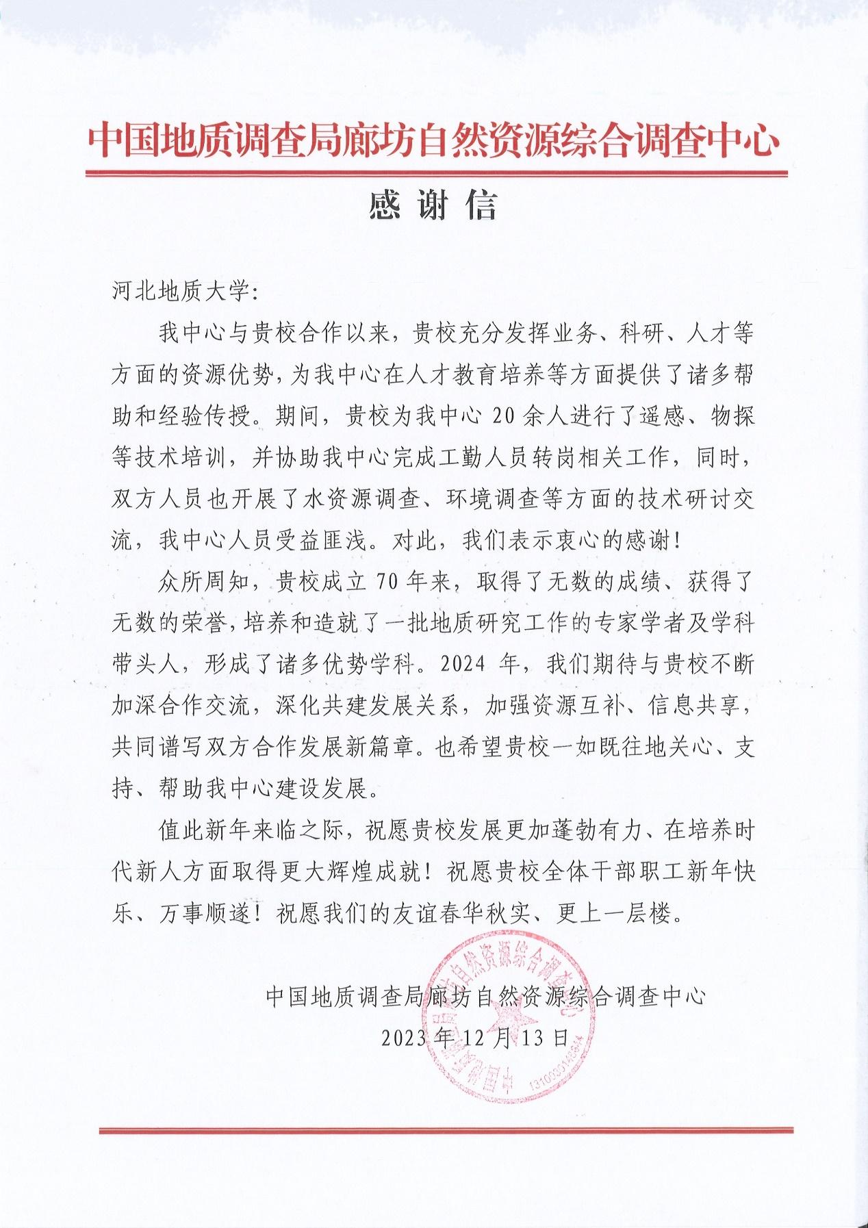 感谢信中提到,中国地质调查局廊坊自然资源综合调查中心与bat365官网合作以来,bat365官网充分发挥业务、科研、人才等方面的资源优势,为廊坊自然资源综合调查中心在人才培养等方面提供了诸多帮助和经验传授。同时,双方通过全面战略合作,取得了丰硕的成果。