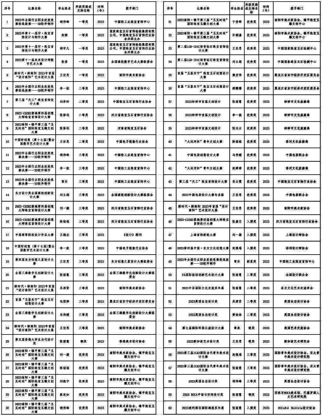 2023年度产品设计(珠宝首饰设计方向)专业学生获奖情况统计