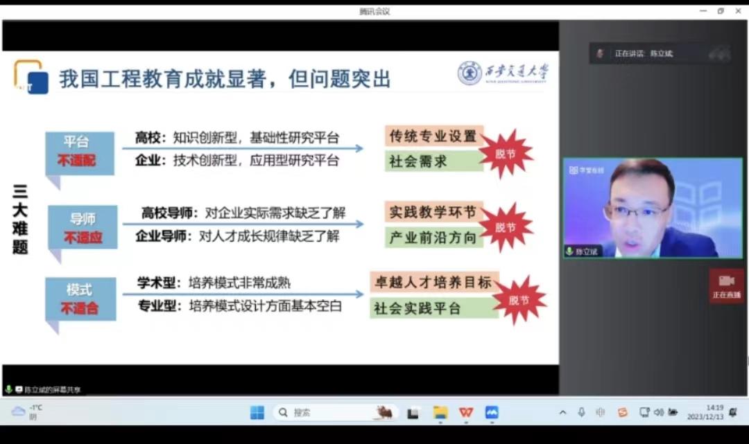 本次研修班包括两场专题讲座。12月13日下午,西安交通大学实践教学中心副主任、创新创业学院副院长陈立斌教授为bat365官网实践师生分享了西安交通大学科教融汇、产教融合的探索与实践。