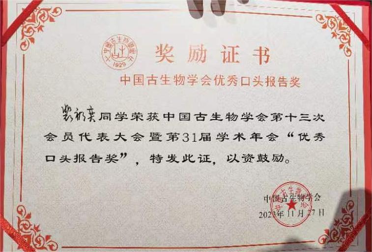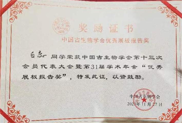 此次参加国内古生物学专业最高级别会议,充分展示了bat365官网古生物学坚实的科研力量和bat365官网古生物专业研究生培养的高质量发展及“全过程”性的育人思路。会议共安排427个分会场口头报告,78个展板报告,大会除邀请教师进行学术成果汇报外,还为现场参会的学生专门设立了参会奖项,以表彰优秀的学生研究成果,现场参会的地球科学学院古生物学与地层学专业研究生分别做了3个口头成果报告和5个成果展板,得到了业内专家、学者的肯定,其中研究生白蕊、裴礽奕分别获得大会颁发的“优秀展板报告奖”和“优秀口头报告奖”。