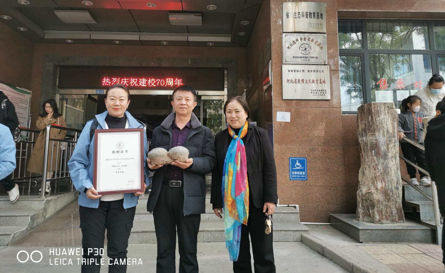 98级水工全体同学向学校博物馆捐赠了菊花石,马静晨以个人名义向校博物馆捐赠了恐龙蛋,充分体现了河北地大学子情怀。