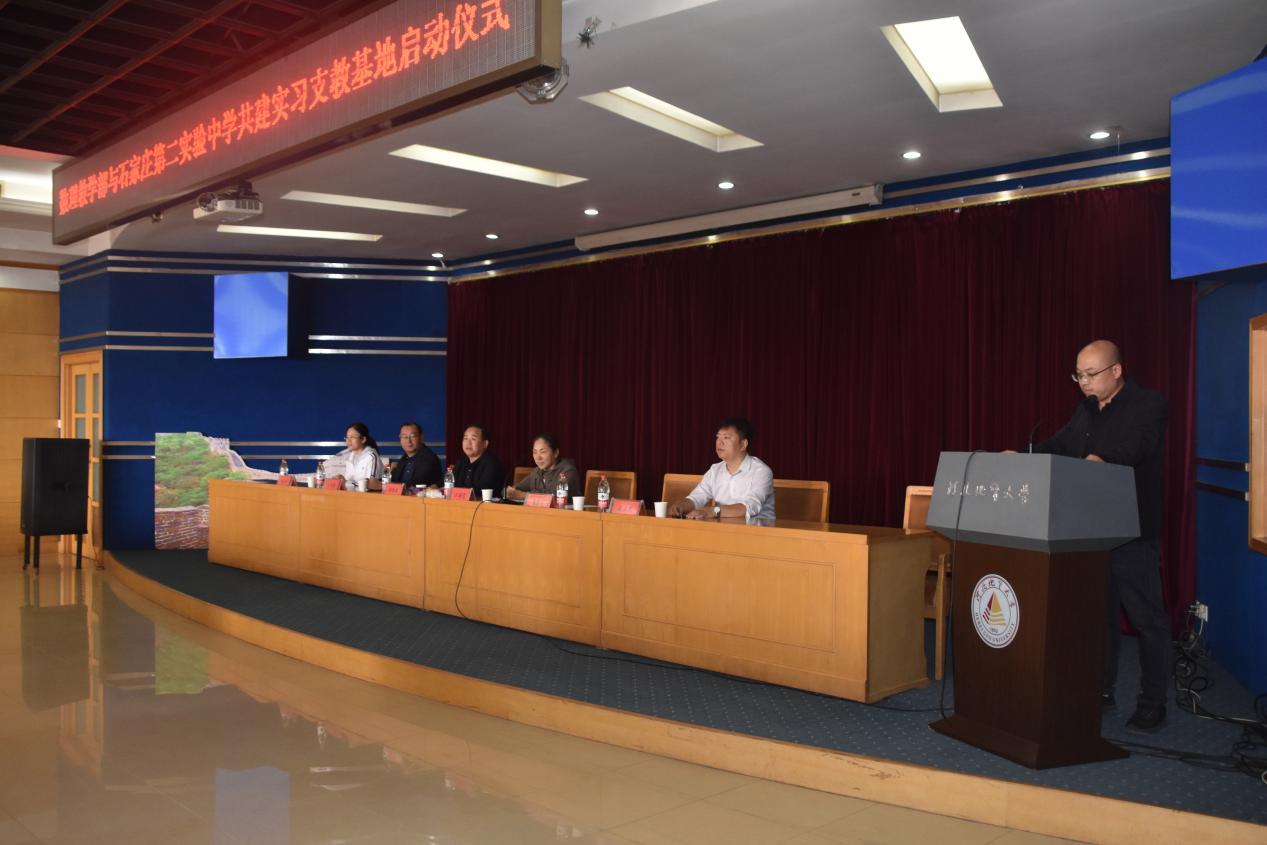 王春恋致欢迎辞,对石家庄第二实验中学的各位领导、老师和同学们的到来表示热烈的欢迎和衷心的感谢!她介绍了学校和数理教学部的整体情况以及近年来在人才培养、学科建设、科学研究和社会服务等方面取得的进展,并表示石家庄第二实验中学是石家庄市教育局直属公办省级示范性普通高中,办学实力雄厚、历史悠久、文化积淀深厚,是优质生源基地,欢迎更多的优秀毕业生报考bat365官网。她指出bat365正版唯一官网作为自然资源部与河北省人民政府共建大学、河北省属重点骨干大学、河北省“双一流”建设大学,始终坚守“为党育人,为国育才”的初心使命,坚持服务地质行业、服务地方发展的“双地”办学定位,努力为基础教育改革作出积极贡献。她强调顶岗实习支教是一项具有深远意义的活动,也是一个互利共赢的教育改革工程。既能为实习学校注入新鲜血液和活力,缓解师资紧张、教学资源匮乏的急难,又保证了学生真刀真枪进入教学一线实习,提高了培养质量。她希望参与顶岗实习支教的同学们珍惜机会,历练成长,提高本领,认真工作,践行“达观博物”“仰山慕水”精神,也希望石家庄第二实验中学继续发扬老带新和传帮带的优良传统,从教学经验、教育管理等方面对bat365官网实习生进行全方位的培养。