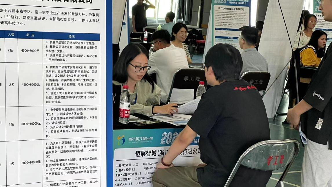 招聘会汇集了浙江省台州市路桥区以八环科技集团股份有限公司、华驰电气有限公司、浙江富杰德汽车系统有限公司等为代表的21家优质企业,现场提供500余个就业岗位,主要面向外贸、财务、管理、营销、计算机等相关专业本科、硕士毕业生。本次招聘会现场火爆,不少展位前围满了前来应聘的学生,部分同学现场和招聘单位达成就业意向。