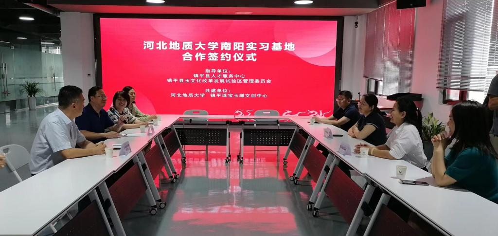 为深入推进学习贯彻习近平新时代中国特色社会主义思想主题教育,满足师生实际需求,解决实习基地建设问题,进一步提升学院实践教学水平;同时也为了全面开展“访企拓岗促就业”专项行动,2023年6月6日至8日,宝石与材料学院党委书记王旭辉、副书记谷月娟以及宝石及材料工艺学专业、产品设计专业(珠宝首饰方向)部分教师,带领两个专业100余名学生赴河南省南阳市镇平县开展实习工作,并与镇平珠宝玉雕文创产业中心签订实习基地协议,镇平县政府办党组成员、县玉文化改革发展试验区管理委员会副主任宋哲、镇平县人才服务中心主任罗立锋、镇平珠宝玉雕文创中心主任杨垒等参加签约仪式。