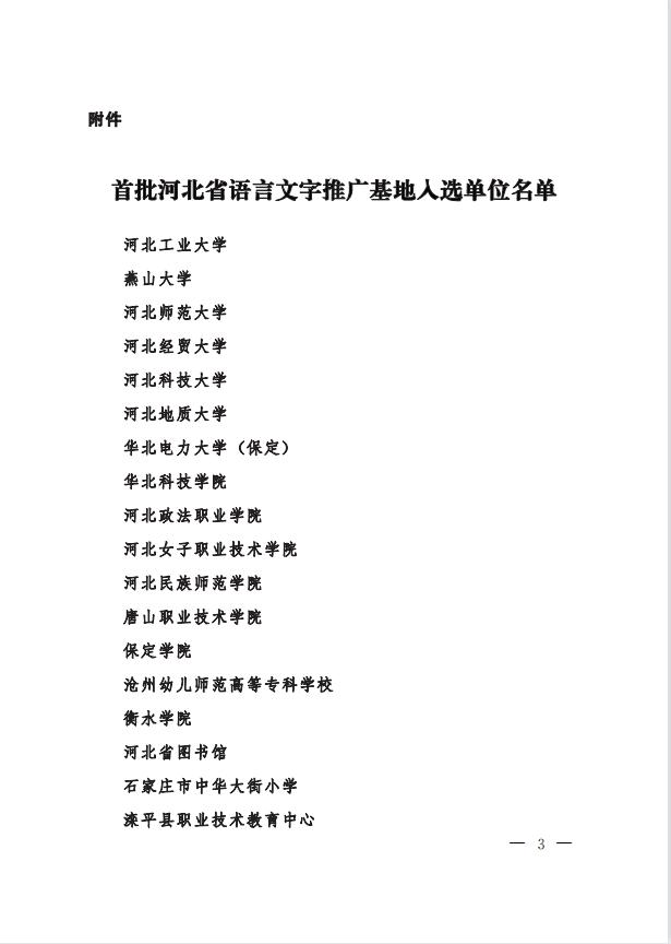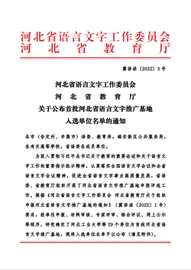 日前,河北省教育厅发布《关于公布首批河北省语言文字推广基地人选单位名单的通知》(冀语函〔2022〕3号),bat365正版唯一官网入选首批河北省语言文字推广基地。