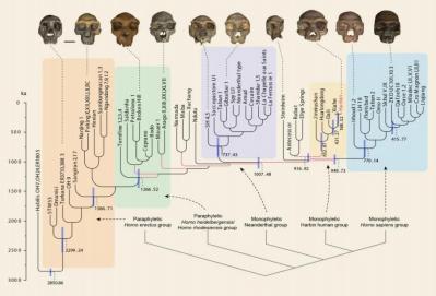 (蓝色区为智人支系,单系;黄色区为龙人支系,单系;紫色区为尼安德特人,支系单系;绿色区为海德堡人支系,副系;浅棕色区为直立人支系,副系)