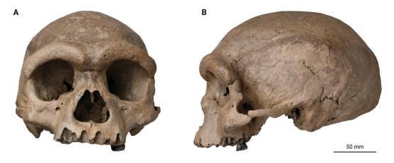 图为龙人头骨化石(左:正面视,右:侧面视)