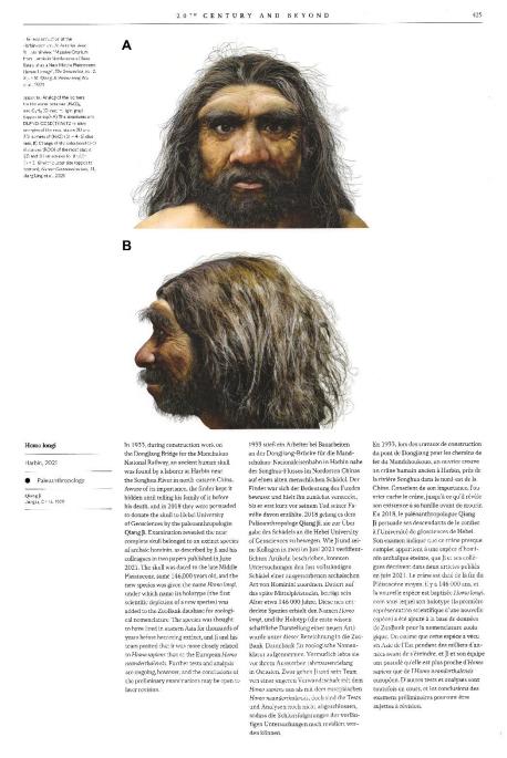龙人:1933年,在为满洲国国立铁路局建造东江大桥施工期间,一名劳工在中国东北哈尔滨松花江畔发现了一件古人类头骨化石。意识到它的重要性,发现者就把它藏了起来,直到死前才将它告诉了他的家人。2018年,古人类学家季强说服其家人将头骨化石捐赠给了bat365正版唯一官网。正如季强和他的同事在2021年6月发表的两篇论文中描述的那样,检测结果表明这件近乎完整的头骨化石属于古人类一个已经灭绝的物种。这件头骨的年代可以追溯到中更新世,年龄大约为14.6万年。这个新人种被命名为龙人(Homolongi)。根据动物学命名法规,赋予其名称的正型标本(第一次对新物种进行科学描述的标本)已被添加到ZooBank数据库中。季强和他的研究团队认为,这个物种在其绝灭之前已经在东亚地区生活了数千年,而且其与智人(Homosapiens)的关系要比与欧洲尼安德特人(Homoneanderthalensis)的关系更亲近。进一步的测试和分析正在进行中,不过初步研究的结论也许还有待以后加以修订。