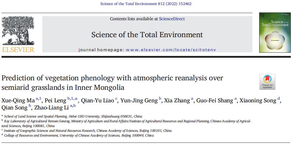 1.马雪晴同学的论文“Prediction of vegetation phenology with atmosphericreanalysis over semiarid grasslands in Inner Mongolia”发表在环境科学一区期刊《Science of the total environment 》(IF=7.883)上,论文从长时序的归一化植被指数(NDVI)中,预测了内蒙古半干旱草原地区32年的植被生长季开始期(SOS)以及植被生长峰值(POS),并建立了广义相加模型(GAM),探索了其与气温、降水、太阳辐射及风速等大气变量之间的响应关系。