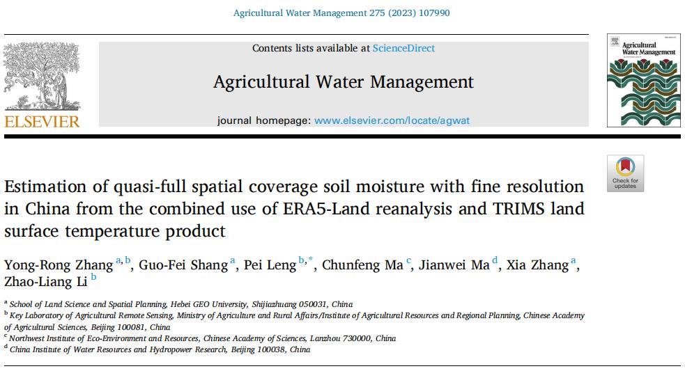 3.张永蓉同学的论文“Estimation of quasi-full spatial coverage soil moisture with fine resolution in China from the combined use of ERA5-Land reanalysis and TRIMS land surface temperature product”发表在农林科学领域一区Top期刊《Agricultural Water Management》(IF=4.471)上。该研究通过假设相同植被类型与植被指数条件下土壤水分对昼夜温差的调节作用一致,建立了基于再分析数据与空间无缝地表温度数据估算全天候公里级土壤水分的方法,为区域尺度农情监测、水资源管理、以及生态环境研究提供了支撑。