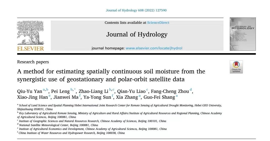 2.闫秋宇同学的论文“A method for estimating spatially continuous soil moisture from the synergistic use of geostationary and polar-orbit satellite data”发表在地球科学领域一区Top期刊《Journal of Hydrology》(IF=5.665)上。该研究首次将国产风云系列卫星数据用于“逐像元”特征空间模型,探索了利用静止卫星像元观测时间一致的优势提升区域内土壤水分反演结果的可比性的问题,最终以我国内蒙古地区为例,从时间尺度聚合的角度获取了该地区时空连续的土壤水分。