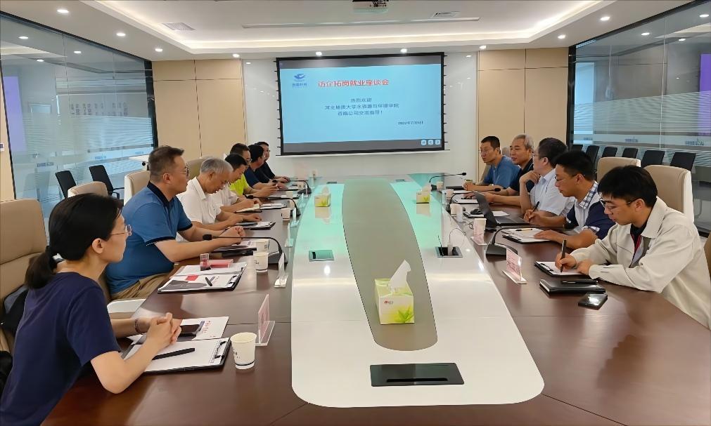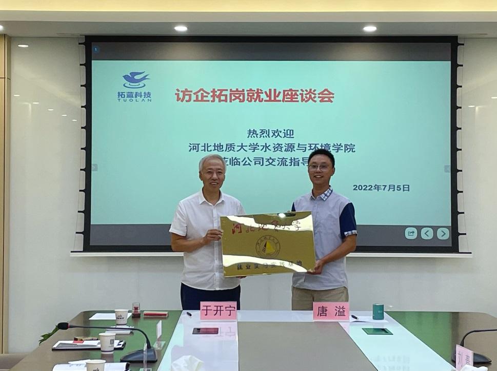 为贯彻落实党中央、国务院和省委决策部署,全力促进毕业生更加充分、更高质量就业,7月5日下午,水资源与环境学院院长于开宁、党委书记李仁杰、副院长陈康、副书记王伟及教师代表赴拓蓝科技河北有限责任公司开展“访企拓岗促就业”专项行动。在拓蓝科技河北有限责任公司总经理杜新平的接待下,一行人走访参观了公司生产车间,并与陈志伟、唐溢等公司领导进行了座谈交流,举行了就业实习实践基地签约和授牌仪式。