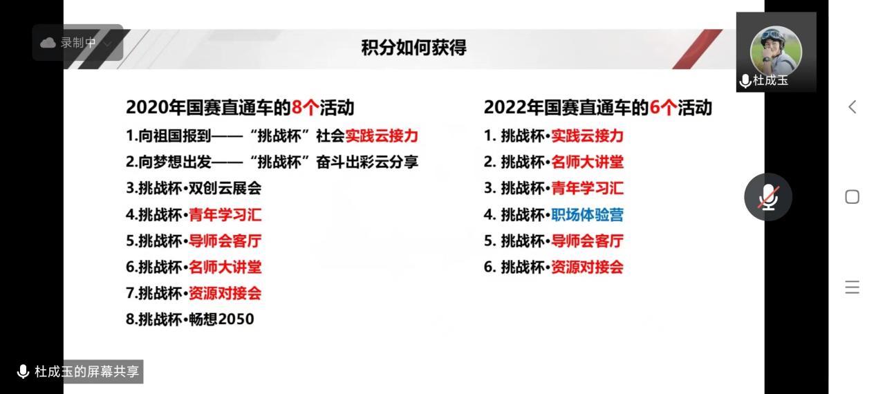 分享人杜成玉分别从活动详细内容、积分主要获得方法等方面展开分享,介绍了在参加名师大讲堂、实践云接力过程中的主要事项,并将往届国赛直通车活动与今年活动进行了仔细对比,指出了两者不同之处以使得参赛选手更好的应对变化。