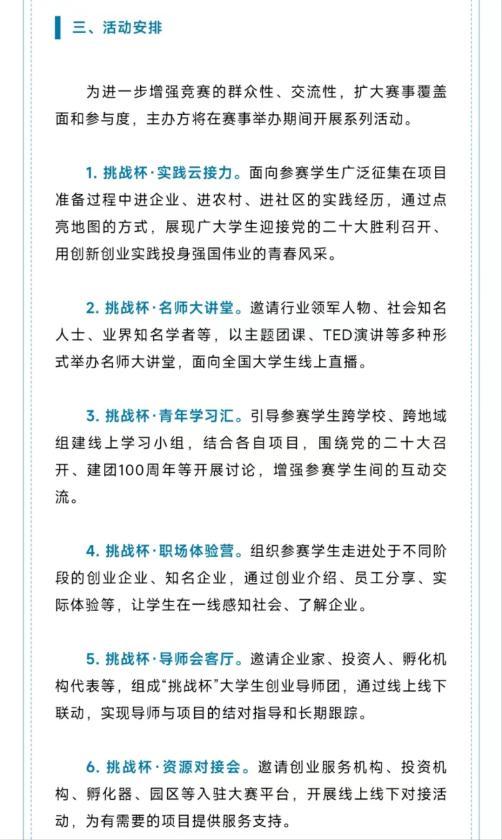 2022年第十三届“挑战杯”大学生创业计划竞赛继续沿用上一届的比赛形式,在赛时期间设置“国赛直通车”渠道,凡符合参赛资格的项目团队,经过报名通道申报审核后,均可通过参加大赛系列活动获得“挑战积分”,并有机会获得直通全国决赛的机会。