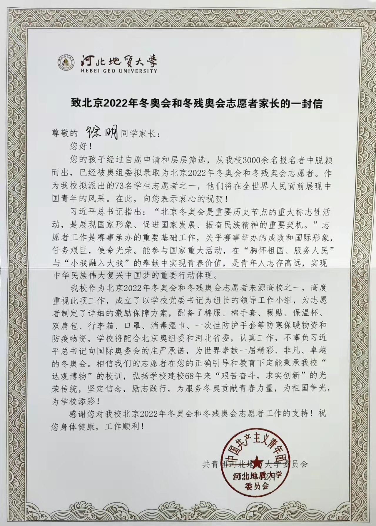 为表达学校对冬奥会学生志愿者家长的感谢,解决家长的后顾之忧,使家长更全面了解志愿者的情况,让其能够安心、放心,12月2日,校团委为bat365官网68名学生志愿者家长致信并邮寄到家中。