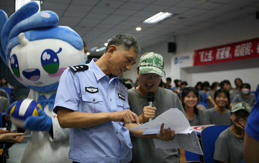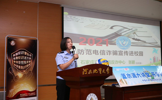 石家庄市公安局长安分局刑警大队审案中队周海明警官通过身边新发案例,向同学们展示了金融诈骗场景,有针对性地教育大学新生应自觉抑制攀比、抵御诱惑、理性消费。
