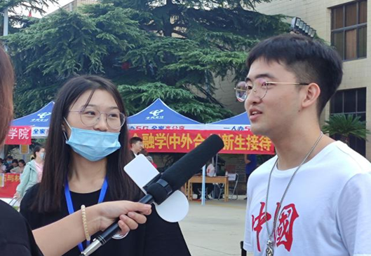 踏进校园,就能看到各个学院的迎新帐篷和忙碌的老师和迎新志愿者的身影。所有人都沉浸在迎接新生到来的愉悦氛围中,尤其是那一幅幅鲜艳的红色横幅,热情洋溢,传达着对新生最真诚的欢迎。迎新点随处可见志愿者忙碌的身影,来自各个学院的志愿者热情帮助着新生搬运行李,在这间隙我们也采访到几位志愿同学。来自语言文化学院的李昊霖和庄雪莹为我们介绍了迎新准备流程:“我们学院提前三天就统计了志愿者人数,分配好各个时间段的人员,然后还开会介绍了流程和具体工作要求,学院为我们统一配置了印有学院名字的衣服方便新同学们辨认”。来自城市地质与工程学院的谷亚珅也介绍了新生报道流程:核算报告检测、身份信息核对登记及帮助新生搬运行李等,每一环节都分工明确,有条不紊。