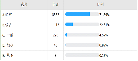 开学后,学院加强线上教学质量监控,学院81名教师全部顺利实施了线上教学,各教学班学生平均到课率约为98%。在线上教学过程中,老师们积极探索在线教学创新,集体备课充分,课堂设计精心,教学热情高涨,教学环节完备;广大学生遵守在线课堂纪律,按时上下课,认真听讲,严格执行教师教学指令,师生共同努力,确保了线上教学的质量。与此同时,对学习各专业课程的学生进行了满意度调查,截止到3月28日,收到调查问卷4941份,涵盖了学院教学对象所在的全部院(系、部)。学院对全部调查问卷进行了统计分析,得到以下调查结果: