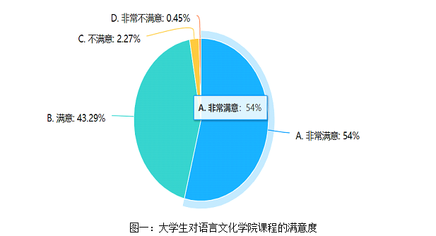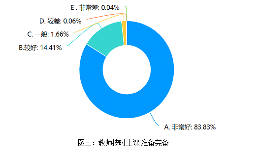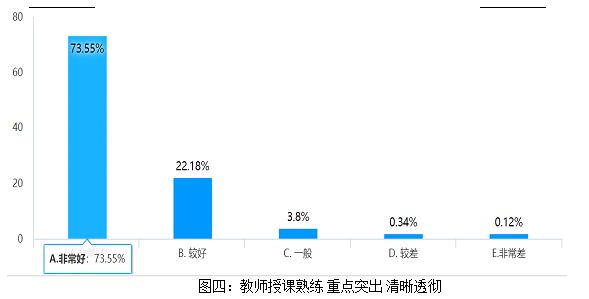 广大学生对语言文化学院课程的总体满意度约为97.3%;教师在线授课网络状况较好率为98%,按时上课情况较好率为98%;学生对教师教授熟练度及重点突出方面评价高,学习的满意度约达到96%;学生对教师在授课过程安排的互动环节的设置非常满意,互动的好评率达到了约94%。