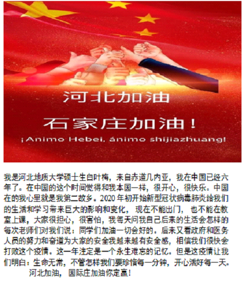 2021年初,石家庄突如其来的新冠肺炎疫情给我们的工作和学习按下了暂停键。按照上级疫情防控要求,学校施行封闭管理,为丰富在校留学生的课余生活,做好人文关怀,同时也鼓励境外留学生积极关注时事发展,参与校园文化活动,国际教育交流中心开展了“加油河北”、疫情居家生活学习现状等题材的征文活动和中国古诗文诵读活动。