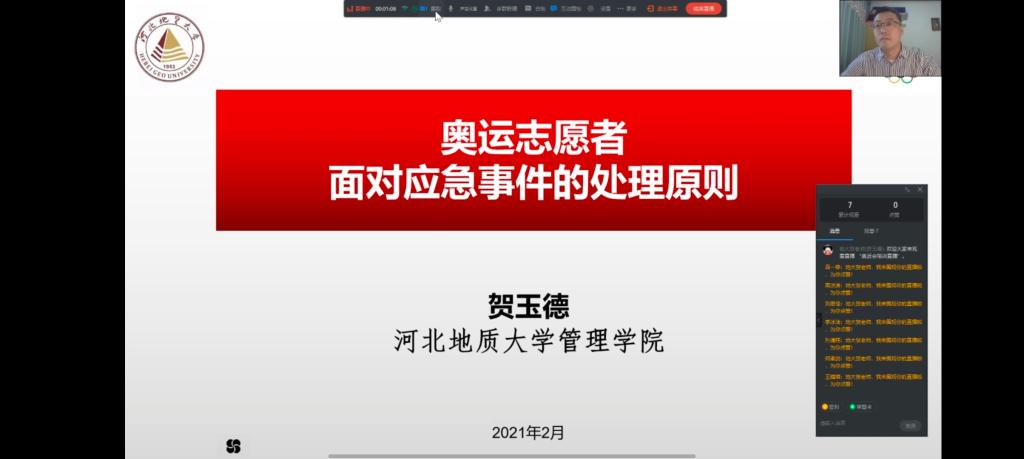 为深入贯彻落实习近平总书记关于筹办北京2022年冬奥会和冬残奥会重要指示,弘扬奥林匹克精神和志愿服务精神、提高bat365官网冬奥会及冬残奥会储备志愿者的应急事件处理能力,3月1日上午,“燃动青春,助力冬奥”云讲堂第三场开播,主题为:奥运志愿者面对应急事件的处理原则。培训邀请管理学院教师、冬奥会核心骨干志愿者贺玉德主讲,200余名冬奥会储备志愿者在钉钉群以线上形式参加了此次培训。